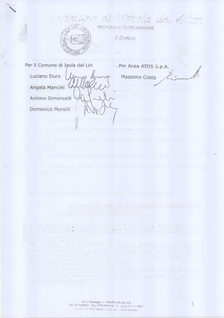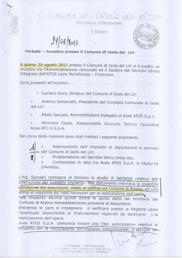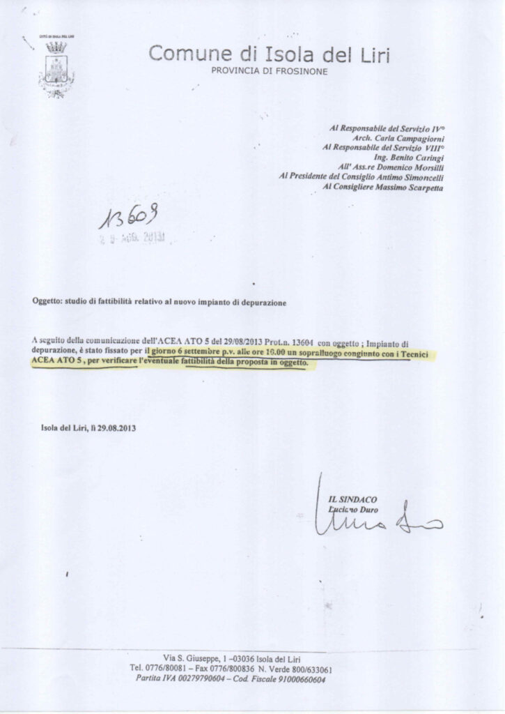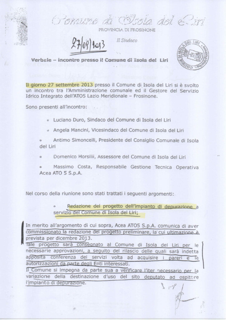 I fatti avvennero dal 29 agosto 2013 al 27 settembre 2013. In un mese fu protocollato un verbale di un incontro presso il Comune di Isola del Liri con l’amministratore delegato di ACEA, documentando la possibile ubicazione del depuratore al confine con il Comune di Arpino. Il successivo 6 settembre 2013, Luciano Duro e i responsabili del Servizio Tecnico, insieme ad altri consiglieri comunali, effettuarono un sopralluogo sul sito. Infine, il 27 settembre 2013, ci fu un incontro in comune con Luciano Duro e Angela Mancini, insieme all’ingegnere responsabile della gestione tecnico-operativa, in cui si concordò che ACEA avrebbe presentato entro la fine dell’anno un progetto preliminare per realizzare il depuratore ubicato nella zona dove oggi la Di Pucchio promette speranze. Il Comune si impegnava, da parte sua, a verificare l’iter necessario per la variazione della destinazione d’uso del sito deputato ad accogliere l’impianto. Quindi, nel settembre 2013, il sito fu individuato.